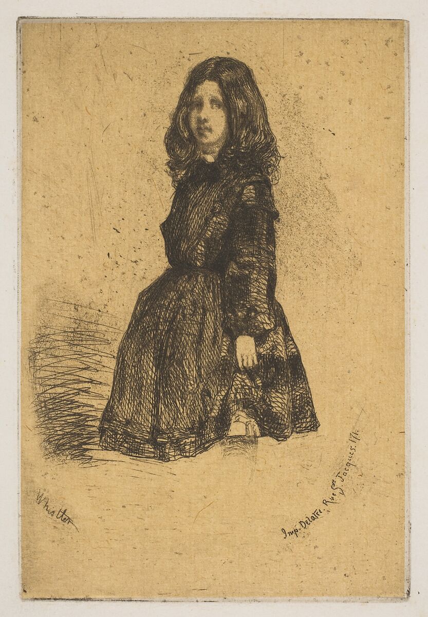 During a stay in London with his sister Deborah Delano Haden while recuperating from a fall, Whistler made this etching of his niece Annie. His brother-in-law, Seymour Haden, a gifted printmaker, encouraged the artist’s first serious efforts in the medium. Here, the emphasis on alternating lights and darks, and the omission of the figure’s legs, demonstrate a greater interest in abstract patterning than portraiture. Whistler gave this print to Thomas Winans, the Baltimore friend who funded his move to Paris in 1855.