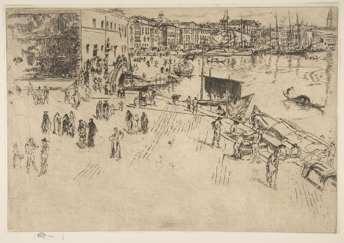 The artist etched the Riva degli Schiavone from his room in the Casa Jankowitz in Venice. Traditional visual hierarchy is overturned and the foreground filled with a triangular expanse of open plaza. Paving stones are suggested with a few etched lines and the edges enlivened with pedestrians, moored boats, and gondolas. An arched bridge leads across a canal toward a curved bank lined with buildings, concluding in the tiny exclamation point of the Campanile. Whistler arrived in Venice in September 1879, commissioned by the Fine Art Society to prepare twelve etchings in three months, but returned to London in November 1880 with many more plates. This print was published in Venice, a Series of Twelve Etchings (the "First Venice Set") in December.