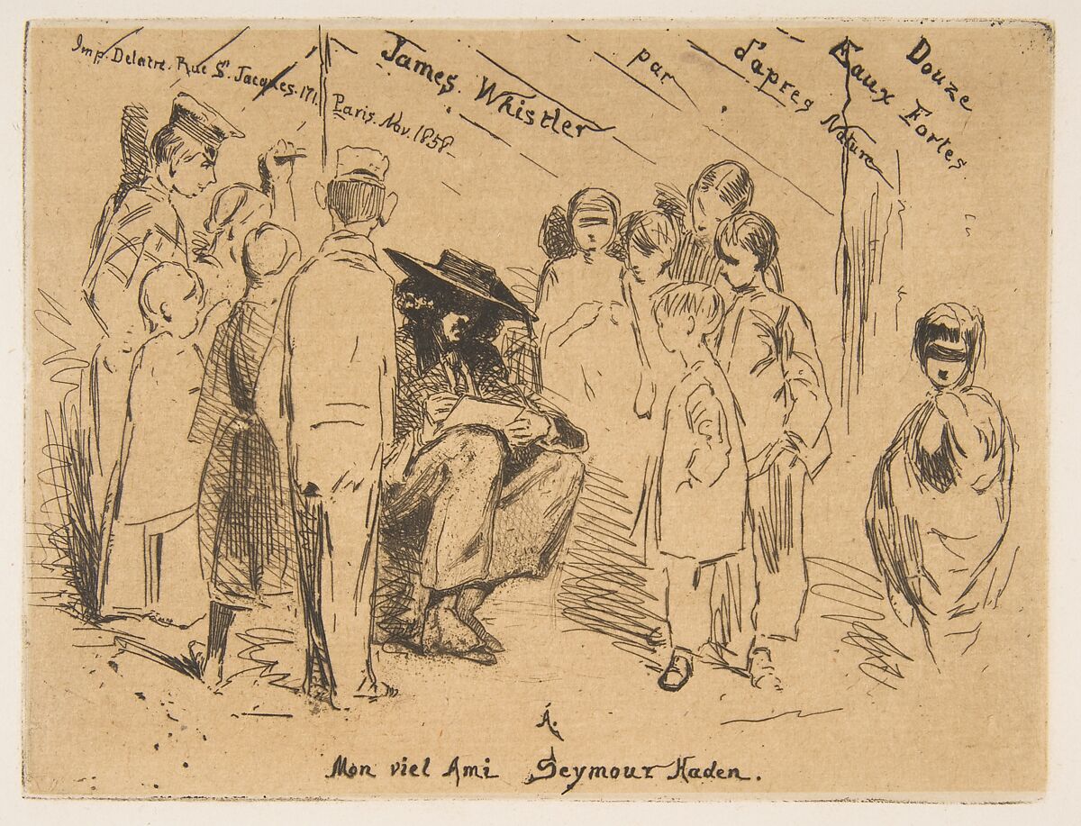 Whistler here depicts himself outdoors working on a copper plate surrounded by fascinated children. The image responds to a Rhineland tour he made in the summer and fall of 1858 and was used to introduce "Douze eau-fortes d'apres Nature" (Twelve Etchings from Nature), the artist's first published set. The title indicates his realist affinities with lettering added to credit Auguste Delâtre as printer and dedicating the work to Seymour Haden. As Whistler’s brother-in-law, the latter had encouraged his first serious etchings. Even when dressed in a loose traveling suit, the artist cuts a dashing figure, with romantically long hair and a beribboned hat.
