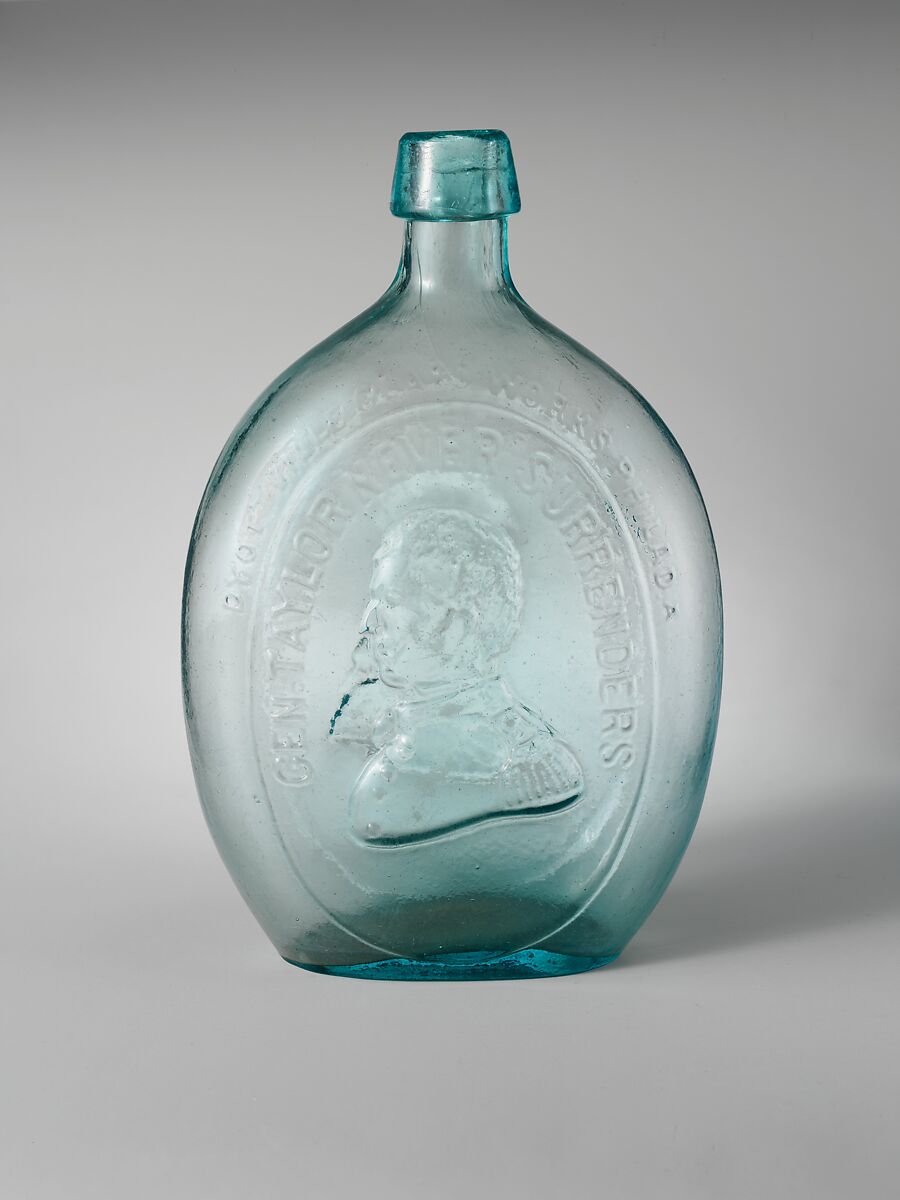 This quart-size flask has a portrait bust of George Washington on the obverse and a portrait bust of General Zachary Taylor on the reverse. The inscription above Taylor refers to his exploits in the Mexican War, 1846–1848, which made him into a popular national hero. The production of this flask probably coincided with Taylor's successful presidential campaign of 1848. The maker's mark on this and similar flasks serves as the basis for attribution for other unmarked Washington-Taylor flasks. This piece was blown in a full-size mold. Its smooth base indicates that a snap case was used to hold the bottle during the finishing process.