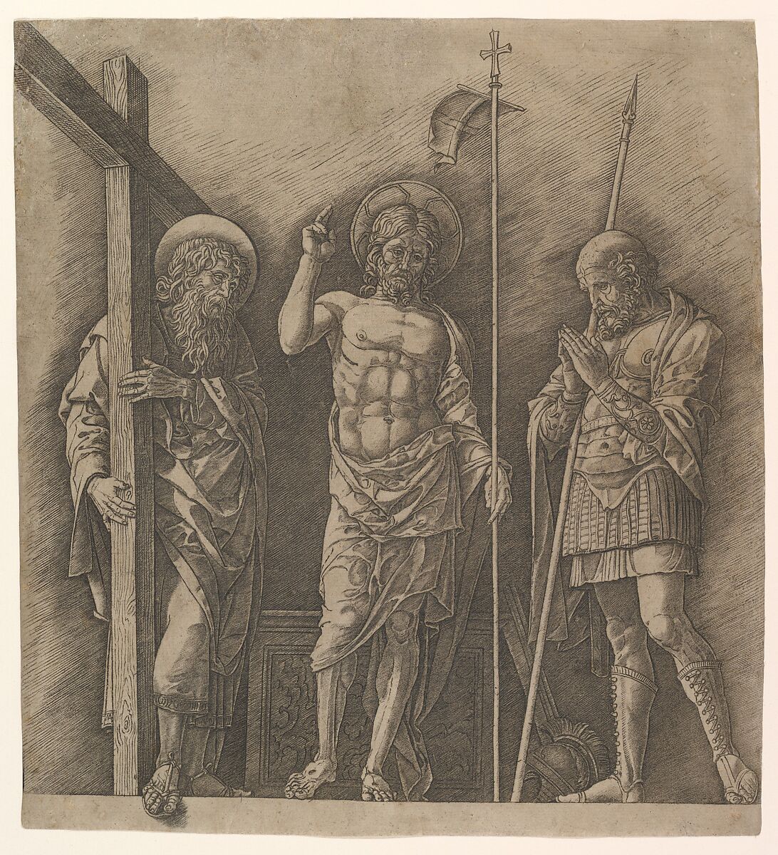 This print belongs to a core group of seven engravings that traditionally have been attributed to the great Renaissance artist Andrea Mantegna. Rich effects of tone and modeling are achieved through parallel diagonal hatching, so finely rendered in this print that the lines appear to dissolve. Strong contours, which are as varied and malleable as a pen line, powerfully carve out the figures. The extraordinary dexterity with which the engraving tool is handled separates this group of seven from other prints produced in the same "Mantegnesque" vein, such as the Four Dancing Muses now thought to be a collaboration between Gian Marco Cavalli and Mantegna (see 20.5.3). The execution of this print, which depicts the Roman soldier, Longinus, who pierced Christ's side, is probably connected to the founding of the Church of Sant'Andrea in Mantua (1472), which housed a relic of Christ's blood.