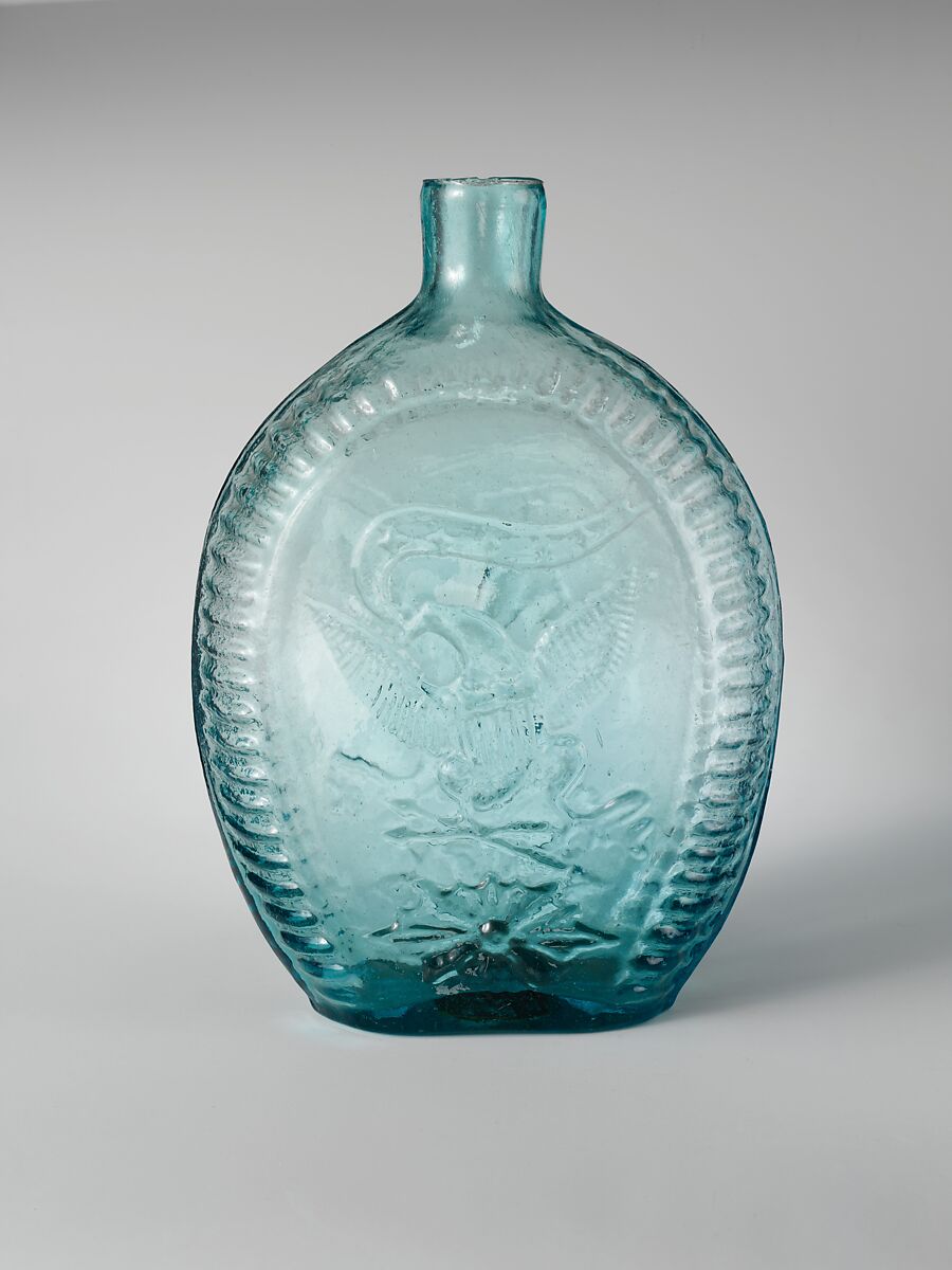 A large American eagle, its wings raised and spread and its head turned to the left, is molded on the obverse of this flask. On its breast is a shield with five vertical bars. There are two arrows in its right talons and a long olive branch in its left. In its mouth, the eagle holds a banner with five small stars. The banner extends above the eagle toward the right. Below the eagle is a large stellar motif.