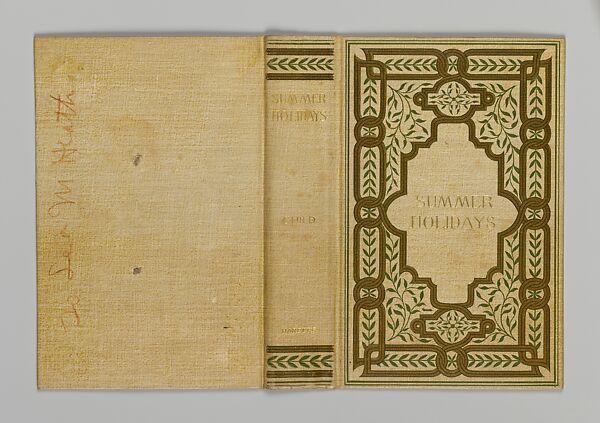 A leading New York late nineteenth century book-cover designer, Morse studied at the Woman’s Art School of the Cooper Union, then under John La Farge before working for Louis C. Tiffany as a painter and designer of stained glass. In 1887 she began to concentrate on book-covers, fufilling eighty-three commissions for New York commercial publishers by 1905. Complementing the text, she chose imagery ranging from classical, to Renaissance, Celtic, Arabic, Gothic, Rococo, Arts and Crafts and Art Nouveau. This design was inspired by sixteenth-century European strapwork. Covered in tan plain-weave reversed cloth, it is stamped in green, brown, and gold and apparently was removed from an actual book.