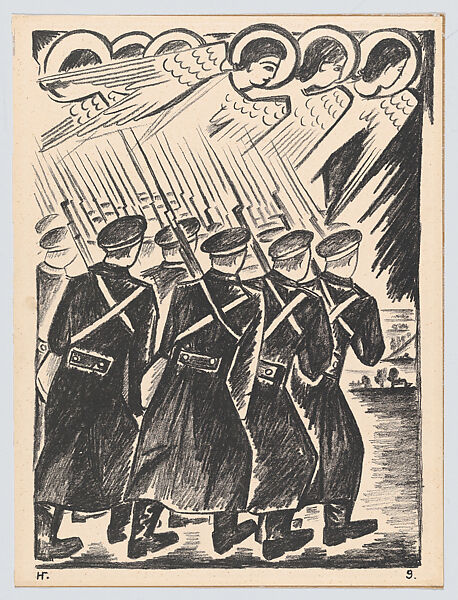 Goncharova portrays a row of protective angels guiding a faceless group of Russian soldiers into battle. The serenity of the scene frames the battle as much as a religious mission—a fight between good and evil—as a contemporary battle between nations. The avant-garde artist’s series Mystical Images of War comprises fourteen lithographs that combine traditional Russian symbols, such as icons, saints, and heraldic arms, with imagery derived from modern life, such as contemporary military uniforms and smokestacks. Like many European artists and intellectuals, Goncharova initially believed the war would usher in a new era guided by peace. Her prints have a spiritual dimension, and several are based on Biblical passages.
