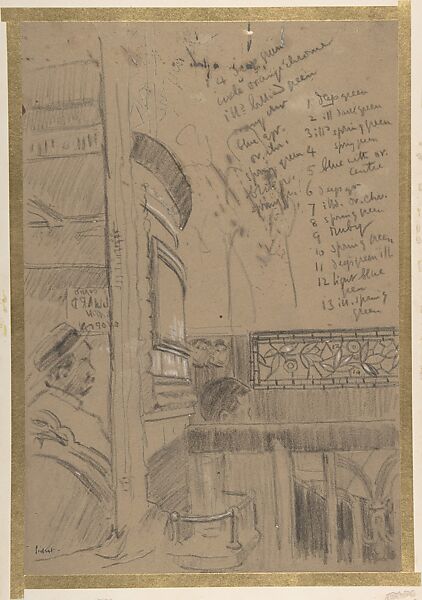Sickert drew this study as he prepared three oil versions of the subject around 1890. Within the interior of the Bedford Music Hall, the popular performer Vesta Victoria strums a banjo on stage, her lightly sketch figure surrounded by a list of detailed color notes. Within a narrow vertical format the artist indicates the ornamented edge of the stage over arched supports, part of the gallery at upper left, and a male audience member wearing a boater.