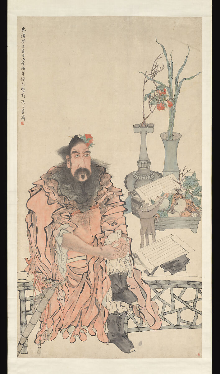 During the late Qing dynasty, Zhong Kui became a popular symbol of Chinese opposition to the misrule of the Manchus and was often portrayed glowering ferociously over a motley retinue of cowering ghosts and demons. In Ren Yi's depiction, however, Zhong Kui appears as an elegant, if somewhat eccentric, scholar. His sword sheathed and a blossom stuck in his hair, he sits reading decorously beside a table laid out with archaic bronzes filled with flowers and fruits, an image that suggests it was the Chinese scholars' command of their cultural heritage rather than their military prowess that set them apart from their Manchu overlords.