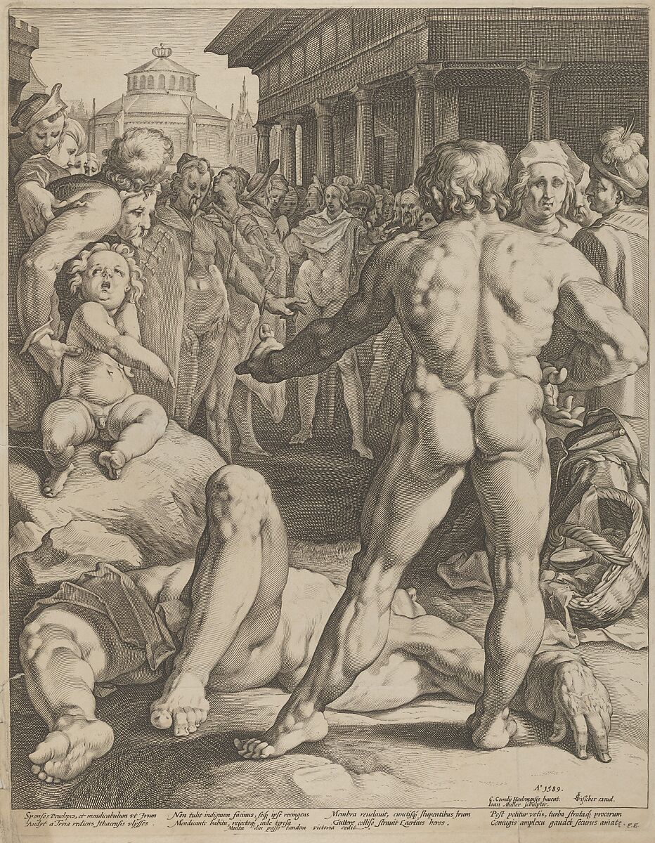 Muller made six engravings after Cornelis; and, impressions of four are in the Met. In addition to the present work they include Cain Killing Abel (56.597.4), Arion on a Dolphin (56.597.5) and The Three Fates Clotho, Lachesis and Atropos (56.597.7). The Fight Between Ulysses and Irus illustrates an event from Book 18 of the epic poem of Homer, The Odyssey. Finally returning to Ithaca after years of wandering, Ulysses discovers that his wife Penelope is besieged by suitors who, believing he was dead, wish to marry her. Disguised as a beggar, Ulysses goes to see her and is challenged to a fight by Irus, a drunken tramp and companion of the suitors. Ulysses easily defeats Irus, and Muller shows him as he is decribed by Homer; a nude figure, standing victorious over the body of his opponent, his back to the viewer putting on full display: "his big rippling thighs – his boxer’s broad shoulders, his massive chest and burly arms."