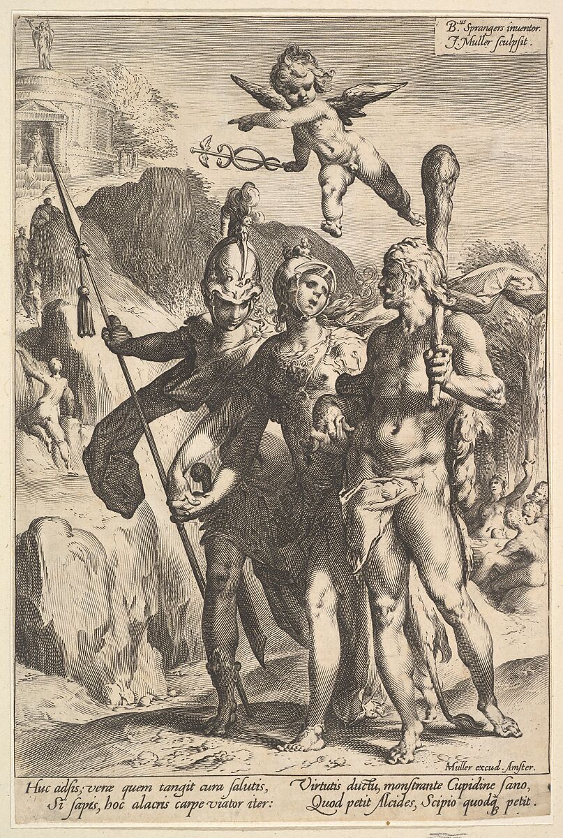 For example, this relatively small composition by Spranger, translated into engraving by Muller, has puzzled collectors and scholars at least since the first great catalogues of prints were published in the early nineteenth century. Its subject, apparently, has no precedent in the visual arts. Minerva, the Roman goddess of wisdom and a symbol of virtue, leads two male figures through a rocky landscape. She is identifiable by two mythological figures decorating her armor, a sphinx on her helmet and the head of a gorgon just visible on her breastplate. On her left is Hercules, a demigod, son of Jupiter and a mortal woman and one of the great heroes in Roman mythology. He can be identified by his club and the lion skin he wears wrapped around him. The third figure is Scipio Africanus, a Roman general and hero of the Second Punic War, which was fought against Carthage in the third century BC. This figure is often mistakenly described as Mars, although he has none of the god’s attributes and the name Scipio is included in the Latin inscription below the image.