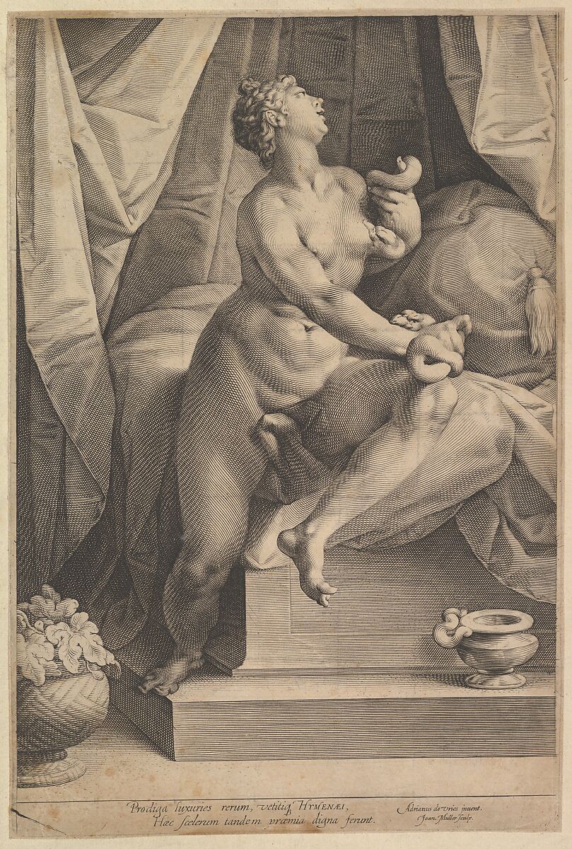 In the mid- to late 1590s Muller made eleven engravings after works by the sculptor Adriaen de Vries. De Vries was a pupil of Giovanni da Bologna and introduced the former’s Florentine Mannerist style to the court of Emperor Rudolf II in Prague. Muller himself never visited Prague, although he made prints after designs by various artists working for the emperor, in addition to those after De Vries. The prototype for this image of Cleopatra is lost, and the only record of De Vries’s sculpture is the engraving itself. Proof impressions of the print in which the background is blank suggest that the interior setting may have been added by Muller to create a context for what was originally a free-standing statue.