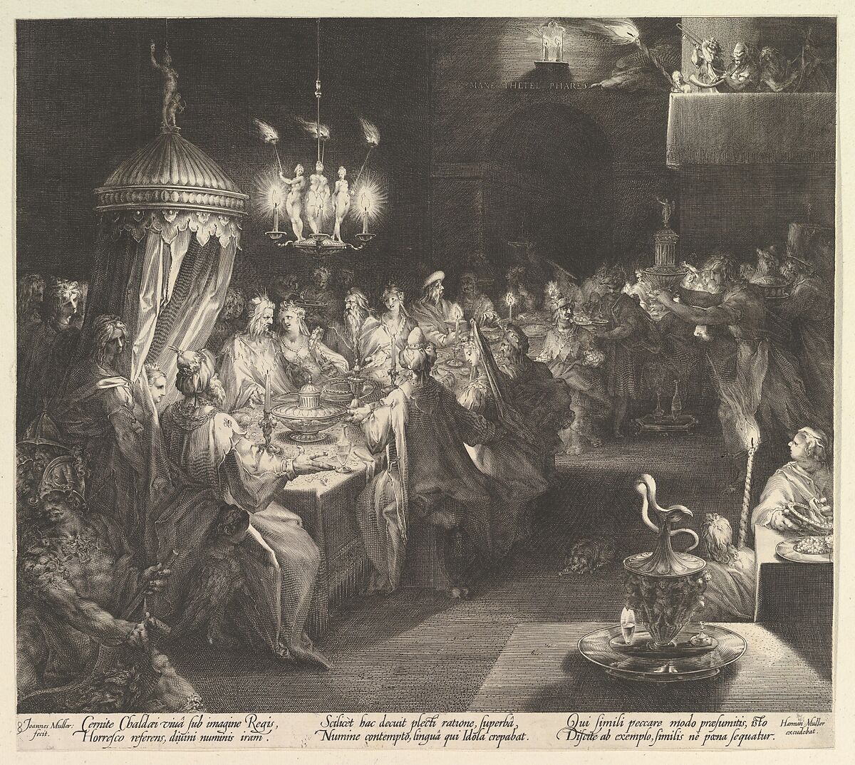 The story of Belshazzar’s Feast is from the Book of Daniel, chapter 5 and describes a lavish banquet given by the Babylonian king, Nebuchadnezzar. The host and guests converse lewdly and blaspheme God, all while eating and drinking from sacred plates and vessels rescued from the Old Temple in Jerusalem, and thus polluting them. Suddenly a disembodied hand appears and writes a mysterious phrase on the wall: ‘MANE THETEL PHARES.’ Shocked by the event, they send for the prophet Daniel to decipher the meaning of the words. He explains that they literally mean that God weighed Belshazzar’s behavior and found it wanting, and that therefore his kingdom was to be destroyed. Later that night the king is murdered, and Darius the Mede becomes ruler of Babylon. The Latin verses below the image warn the viewer against similar blasphemy and sinful behavior.