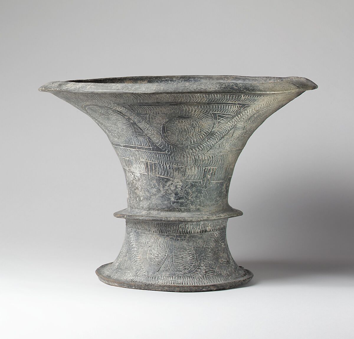This striking beaker-shaped vessel is typical of works attributed to the earliest phases at Ban Chiang. It was formed in two pieces: a large open-mouthed container with a rounded base that is placed into a shorter pedestal with a broad foot. A prominent flange conceals the seams where the two sections are joined. Covering the entire surface of the vessel, exuberant curvilinear forms were first incised and then further elaborated with impressed decoration. The dark gray color of the vessel is the result of both firing in hot wood first and the glow of oxygen over the vessel as the fire died down. Traces of burnishing are visible on the surface of the vessel, particularly in the interior.