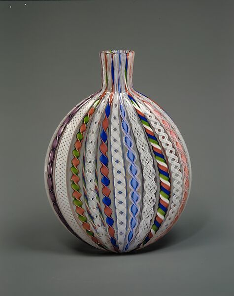 An example of "filigree" glass, this flask was made by Nicholas Lutz of Saint-Louis, France, who brought it to America when he emigrated, probably in the 1860s. From 1869 Lutz worked for the Boston and Sandwich Glass Company where he initiated the production of art glass, including several varieties that were inspired by Venetian glassmaking techniques.