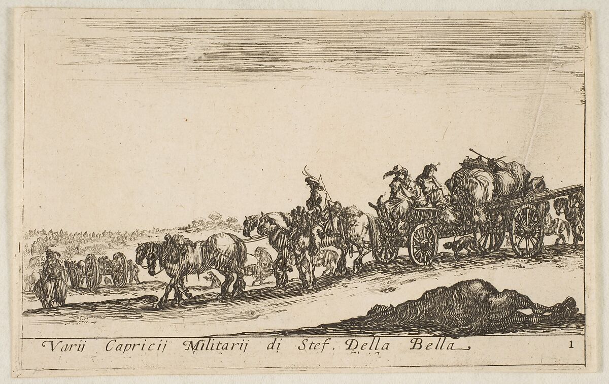 - Title: Plate 1: a horse drawn cart carrying people and goods, dead horse in the foreground, from "Various Military Caprices" (Varii capricci militari)