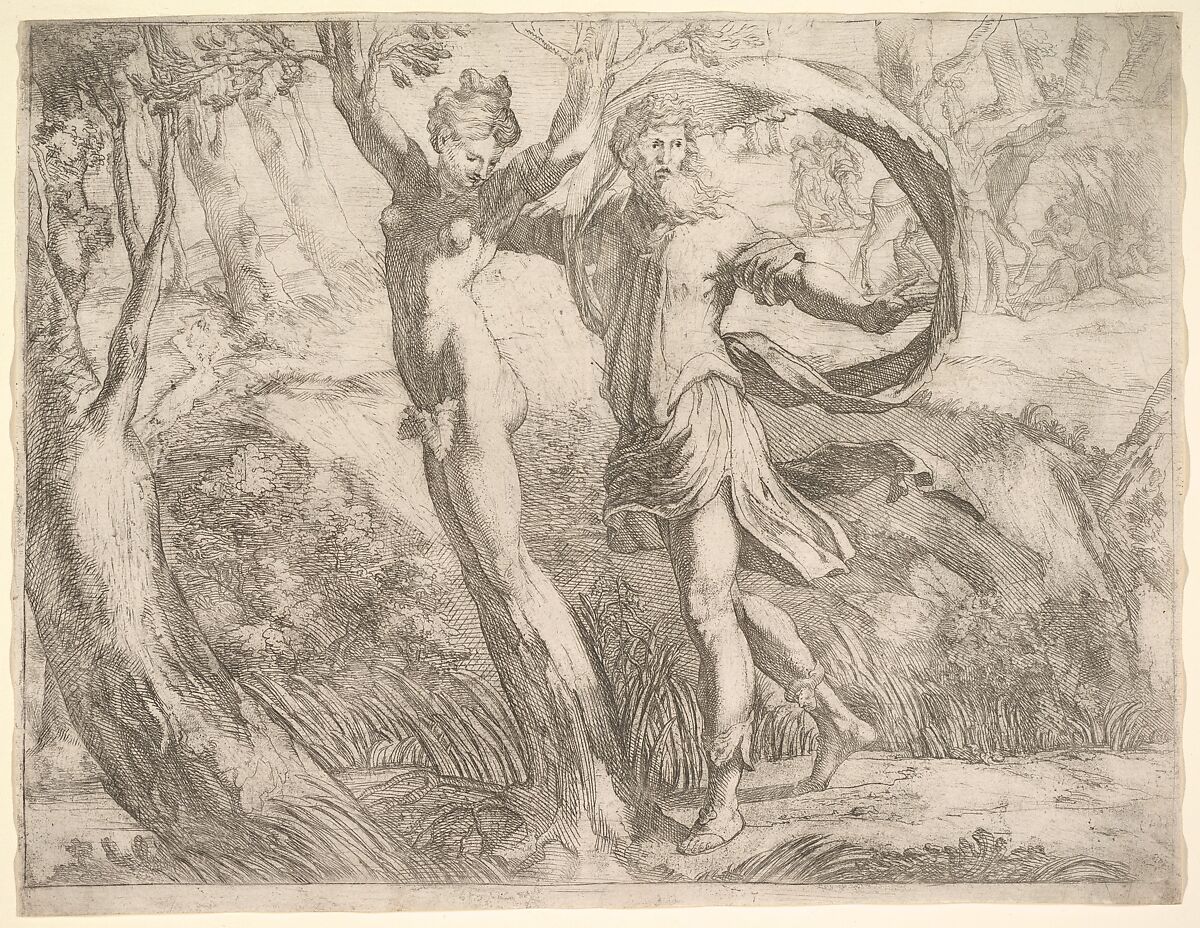 This etching reproduces the composition of a damaged drawing attributed to Parmigianino (Albertina, Vienna) and is possibly the work of his Parmese follower Jacopo Bertoia.