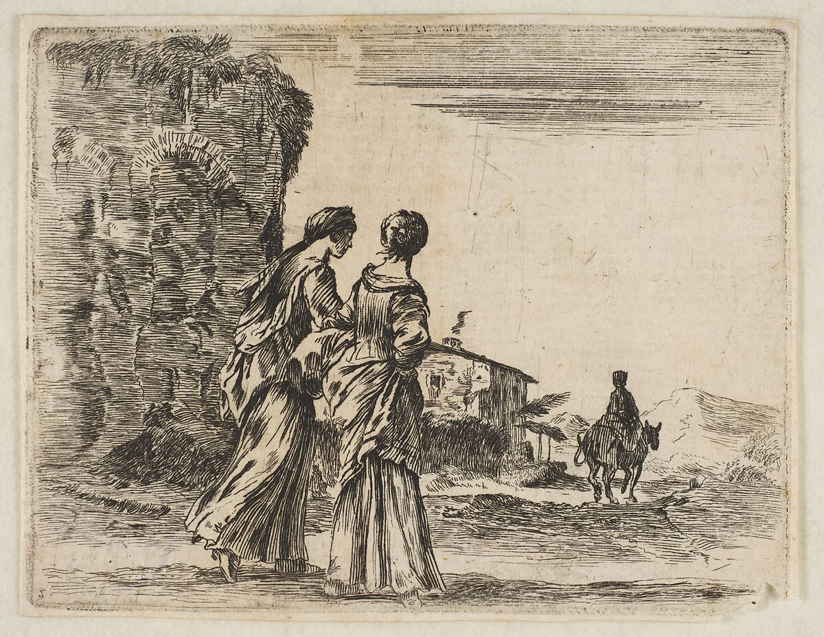 - Title: Plate 3: two girls walking towards the right, seen from behind, a woman on a horse to right in background, from "Diversi capricci"