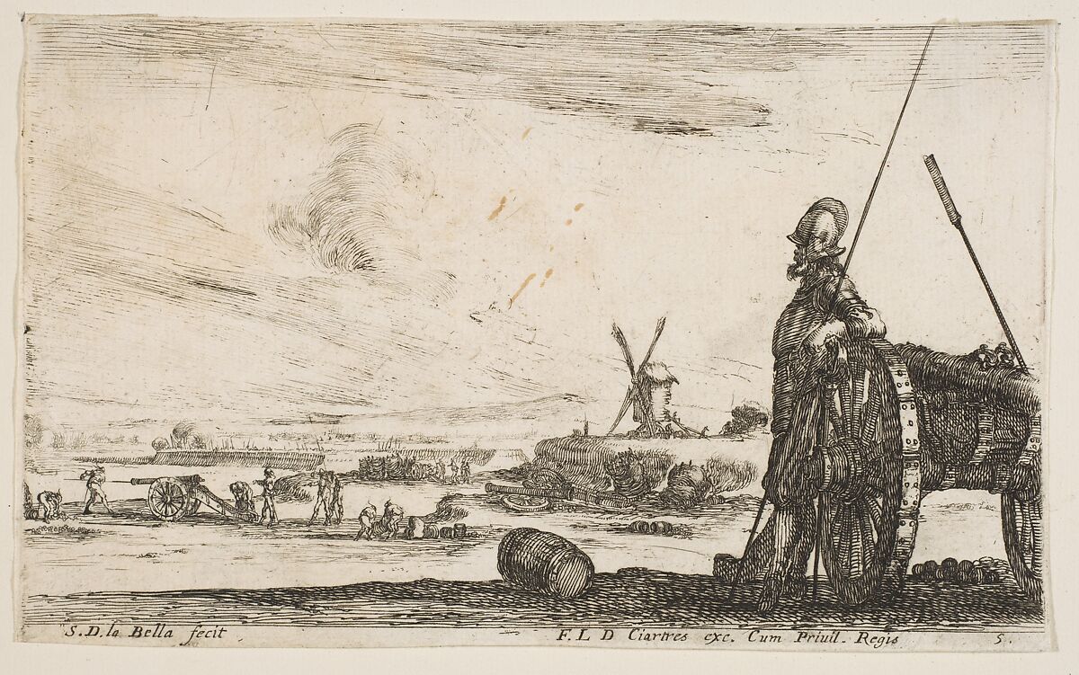 - Title: A Pikeman standing at right next to a canon, other military figures in the background, plate 5 from "Various Military Caprices" (Varii capricci militari)