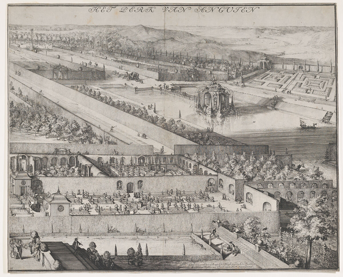 View of part of the gardens of the castle of Enghien near Brussels. Several enclosed gardens are visible in the foreground, and in the upper right a square water basin is with a gazebo and fountain is depicted. Long walk and carriage lanes run towards the upper left corner of the print. People are depicted enjoying the delights of the garden, or inversely working to maintain it. The various parts of the garden have been individually numbered.