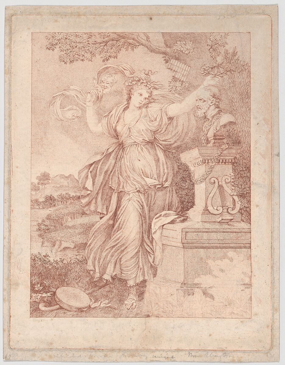 Beauty and talent propelled Fanny Barton (later Mrs. Abington) to fame, from humble beginnings as a flower girl and milliner's assistant. Associated with the Drury Lane Theatre, she excelled in contemporary comic roles by Richard Brinsley Sheridan and Colley Cibber and, in Shakespeare's plays, performed Ophelia, Desdemona, Beatrice and Portia. Horace Walpole compared her favorably to Garrick, and the artist James Northcote noted that, "in her acting she has all the simplicity of nature and not the least tincture of the theatrical." In this image she embodies Thalia, the muse of music, dance, comedy and idyllic poetry, to crown Shakespeare with laurels.