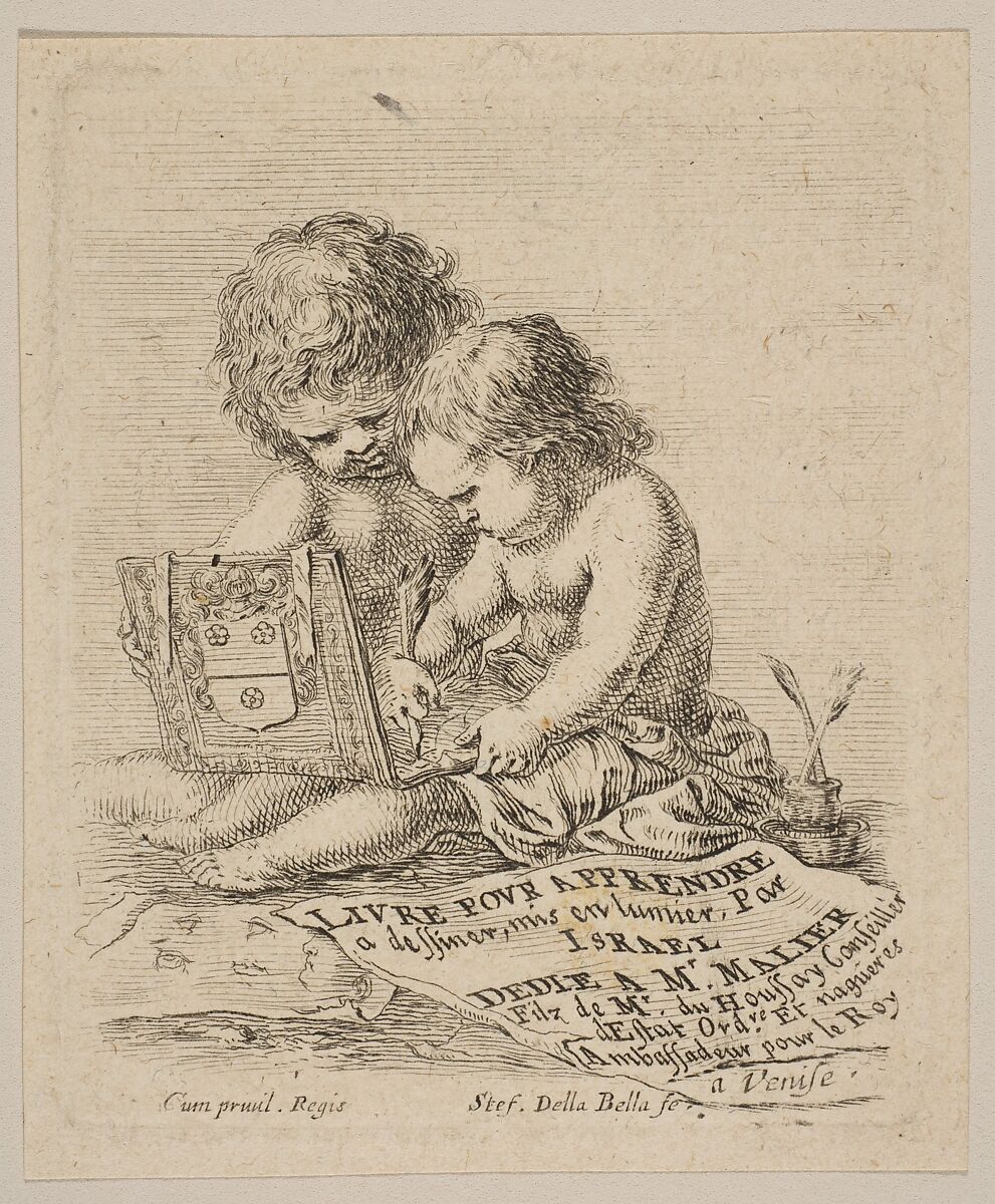 - Title: Plate 1: two children sitting on the ground, the child on the right drawing while the child on the left holding the album, the title page from 'The Book for Learning to Draw' (Livre pour apprendre à dessiner)
