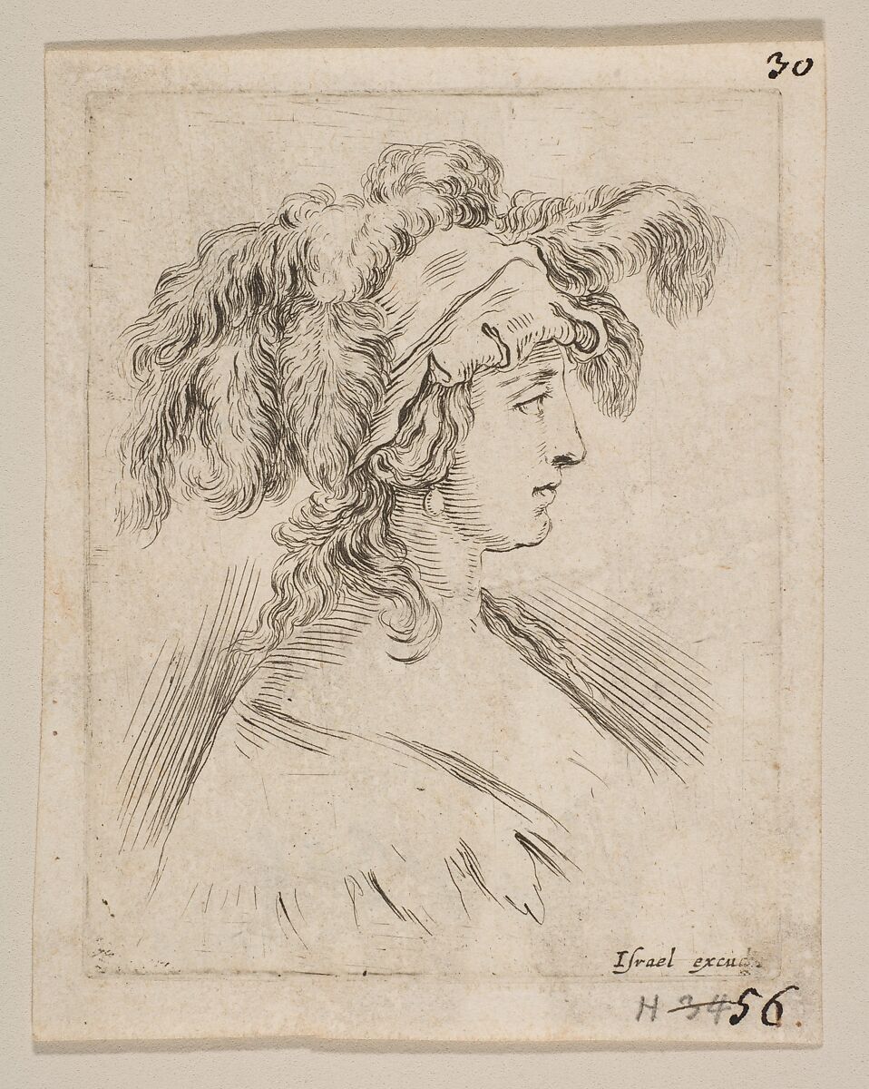 - Title: Plate 15: mid-bust of a young woman in profile wearing a hat topped with feathers, from 'The Book for Learning to Draw' (Livre pour apprendre à dessiner)