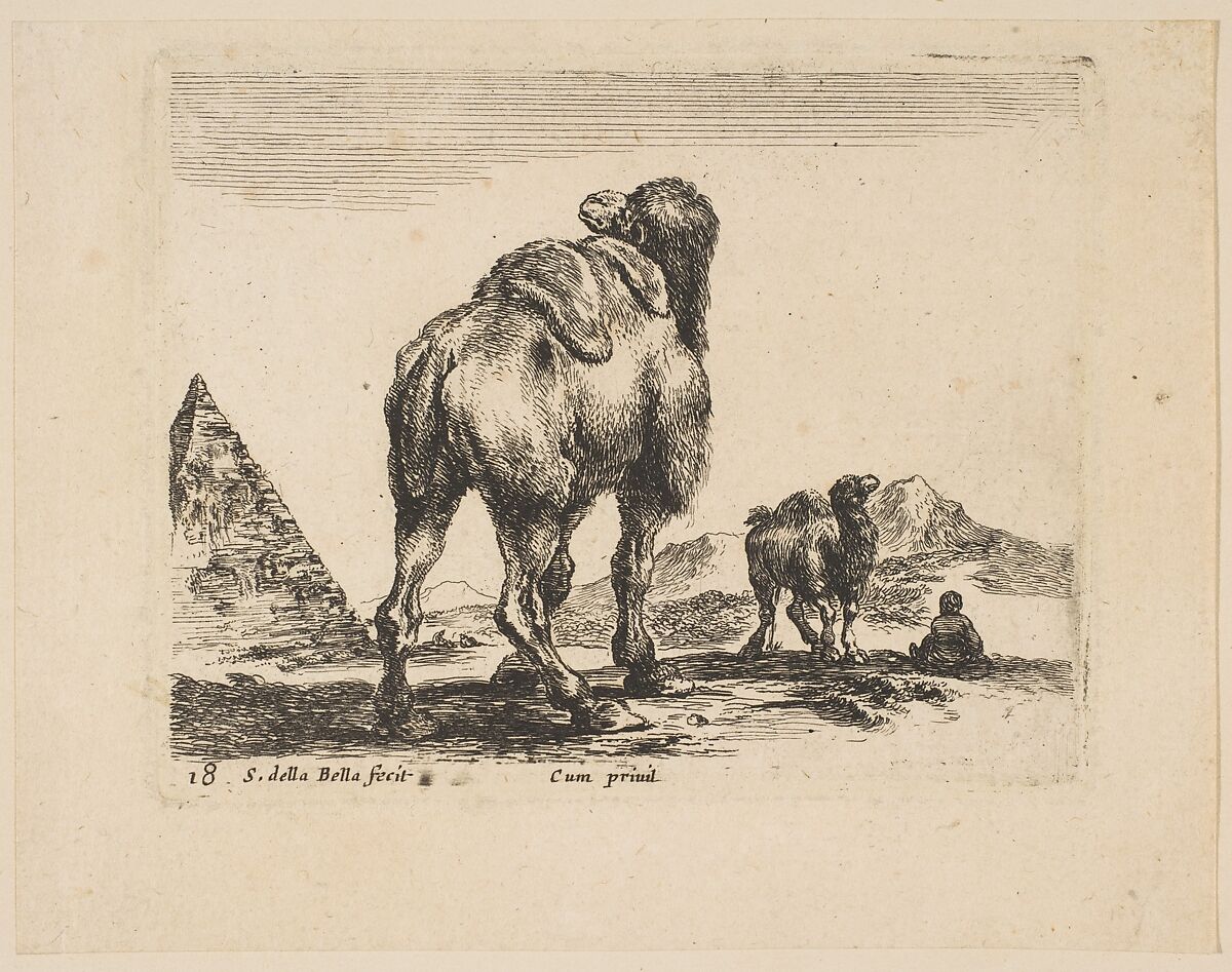 - Title: Plate 18: camel viewed from behind with pyramid at left, from 'Various animals' (Diversi animali)