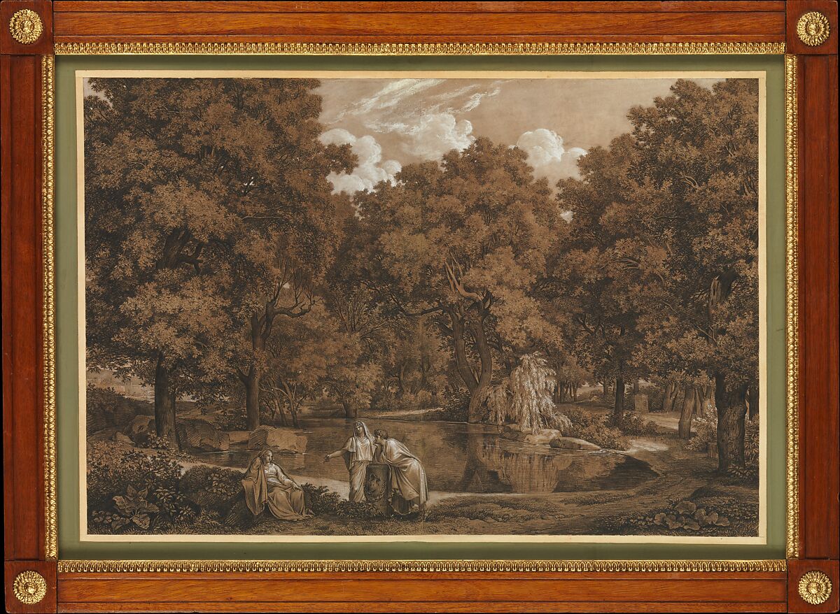 Reinhart made this imposing drawing in Rome in 1792, when he and another leading German artist from the period, Joseph Anton Koch, started making "heroic" or "poetic" landscapes inspired as much by the Roman campagna as by the work of their seventeenth-century predecessors Claude Lorrain, Nicolas Poussin, and Gaspard Dughet. Although the figures are dressed in a style that hints at a specific mythological or historical subject, they were probably used merely to indicate the antique setting of the landscape, as were the villa in the left background and the funerary monuments at center and in the right background. The dense composition and regular hatching are typical of Reinhart's manner throughout his career. The drawing is related to a painting he made in 1796 (Museum Georg Schäfer, Schweinfurt), but it cannot be called preparatory, for it differs from the painting in many ways. Fully signed and dated, and preserved in what is likely to be its original frame, the drawing was made as an independent work of art.