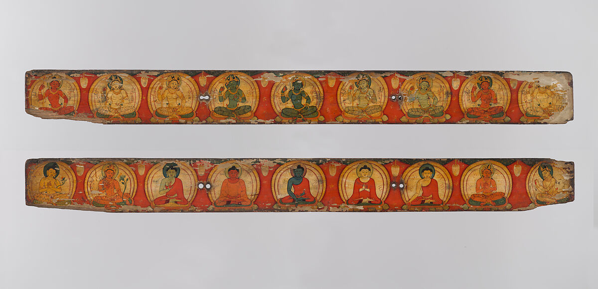 This pair of wooden covers protected the palm-leaf folios of a Buddhist sacred text. One cover has the nine Buddhist goddesses, each holding a staff surmounted by the wish-fulfilling jewel (cintamani), while the other cover has the five transcendental Buddhas flanked by four bodhisattvas. Painted on the interior, the iconography offers a protective field to the holy text within, in this case likely the Perfection of Wisdom text, the Ashtasathasrika Prajnaparamita Sutra.