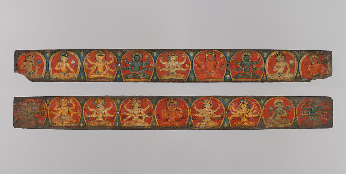 This pair of painted wooden manuscript covers shows a series of Buddhist deities seated on lotus thrones before aureoles, interspersed with cauri-fans hanging above and ritual utensils below. Above are nine bodhisattvas, with Manjushri at center; below, Prajnaparamita is accompanied by six other Taras, flanked by two wrathful guardians.