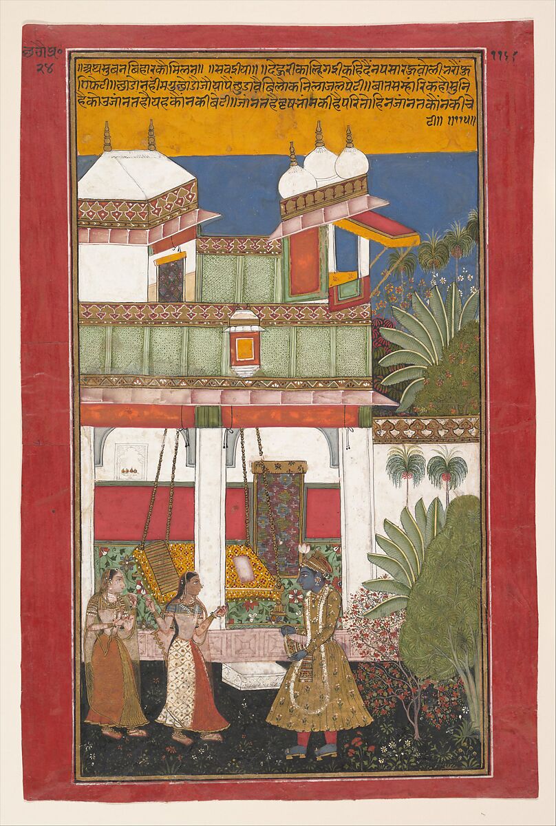 Krishna approaches Radha and a go-between who has facilitated their meeting. The open pavilion and empty bed, allusions to a possible passionate encounter, are a recurrent theme within paintings illustrating the devotional poetry of the Rasikapriya. Bundi workshops developed a refined jewel-like painting style featuring patterned architecture and a verdant conception of nature. While the Bundi aesthetic shares many characteristics with the Mewar and Malwa idioms, especially the architectural consideration of space, contact with the Mughal atelier contributed to its realistic portrayal of the natural world.