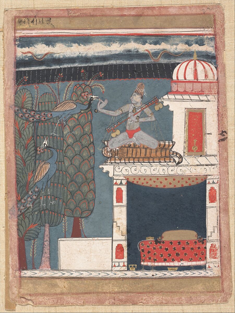 This ragini evokes the rainy season and is given dramatic expression by the bands of heavy clouds and snakelike bolts of lightning across the upper register. The associated text by Lachiman Das tells of a woman, who, stricken by separation from her husband, has dressed as a man and taken up asceticism: “[She] has rubbed ash on her body . . .[and] remembers, in her heart, [her] husband . . . [as she sits] in the courtyard of the hermitage. The dark clouds appeared from the four directions, followed by the birds and brilliant lightning.” The juxtaposition of flattened forms and color fields, which are typical of the Malwa painting style that flourished outside the Mughal sphere of influence, gives this work a forceful presence.