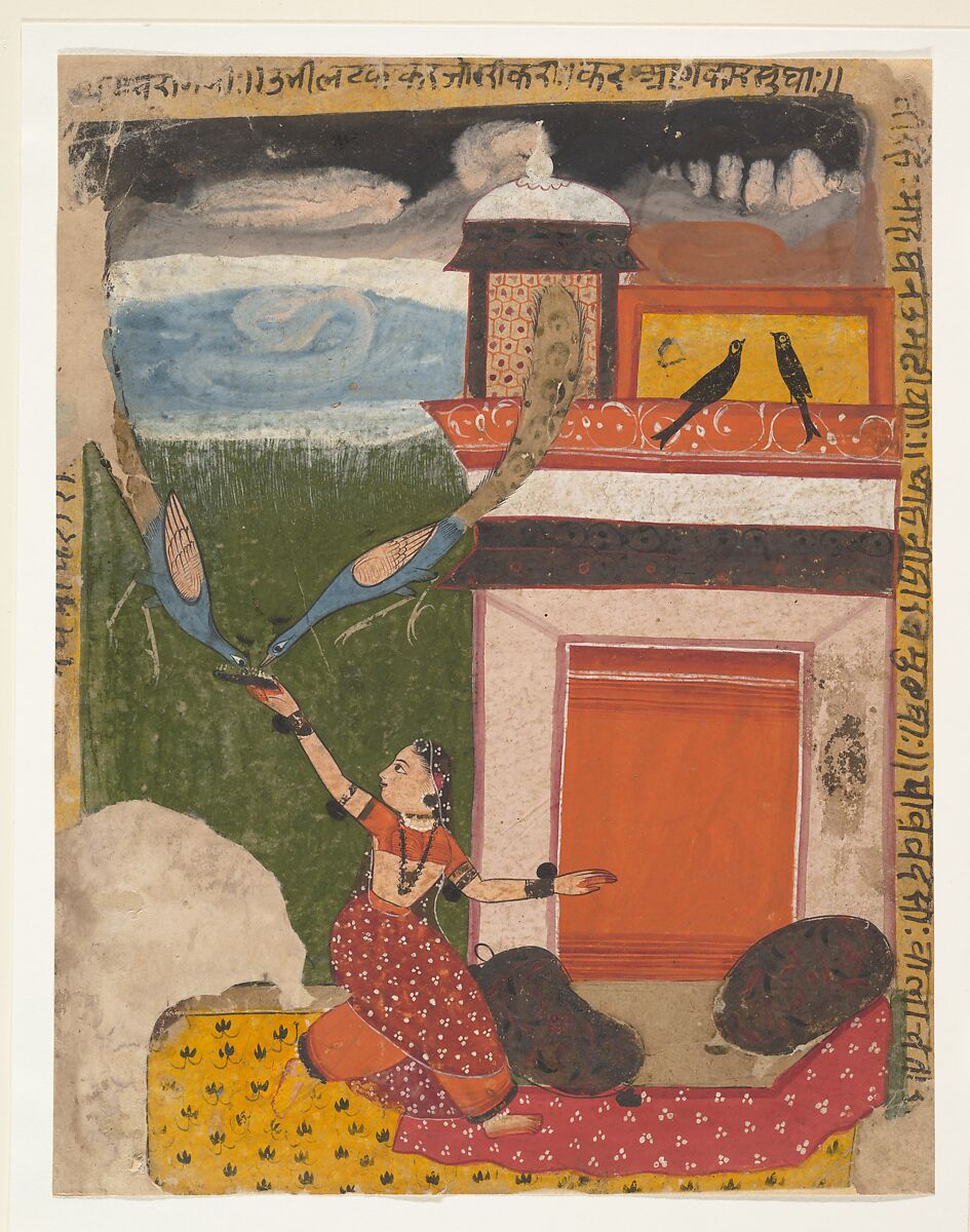 The text of this Ragini tells of peacocks that cry at the threat of rain—here shown in the roiling black horizon and blue lines. Thinking that the peacock’s cry comes from hunger, a lady offers food. The audience would have also understood allusions to Nayikabheda poetry in which the abhisarika nayika (a heroine) travels at night in a storm to meet her lover. The figure type and color palette are distinctly Marwari, while the flattened architecture and color fields are characteristics shared with Malwa painting.