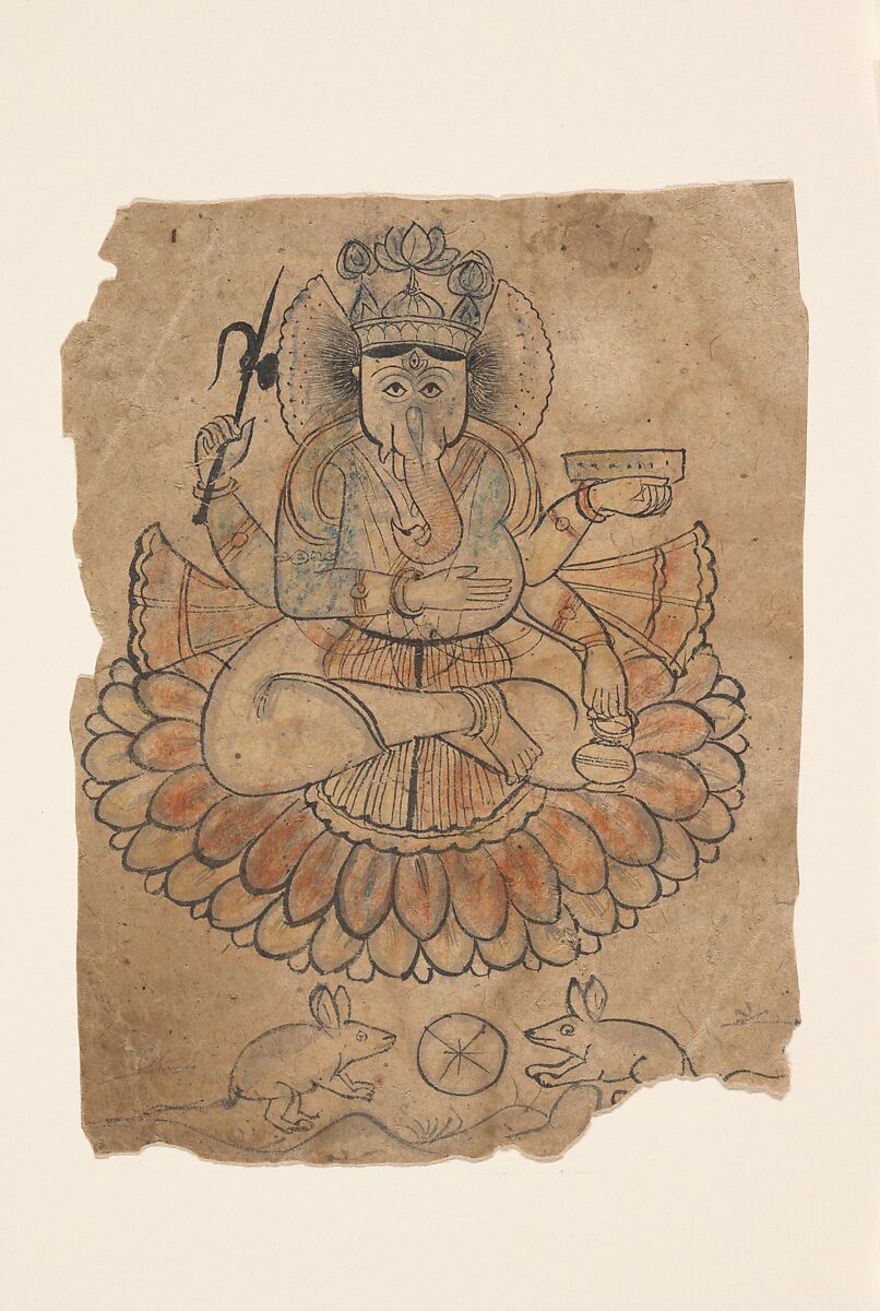 Shown sitting on a multitiered lotus, Ganesha holds a manuscript and water pot in his left hands. His upper right hand grasps an elephant goad, while he places his lower right hand on his stomach. Below him, facing a wheel-like device, are two rats; as an animal that, according popular tradition, can overcome any obstacle, the rat is an appropriate vehicle for him. This image was likely purchased by an individual for personal veneration.