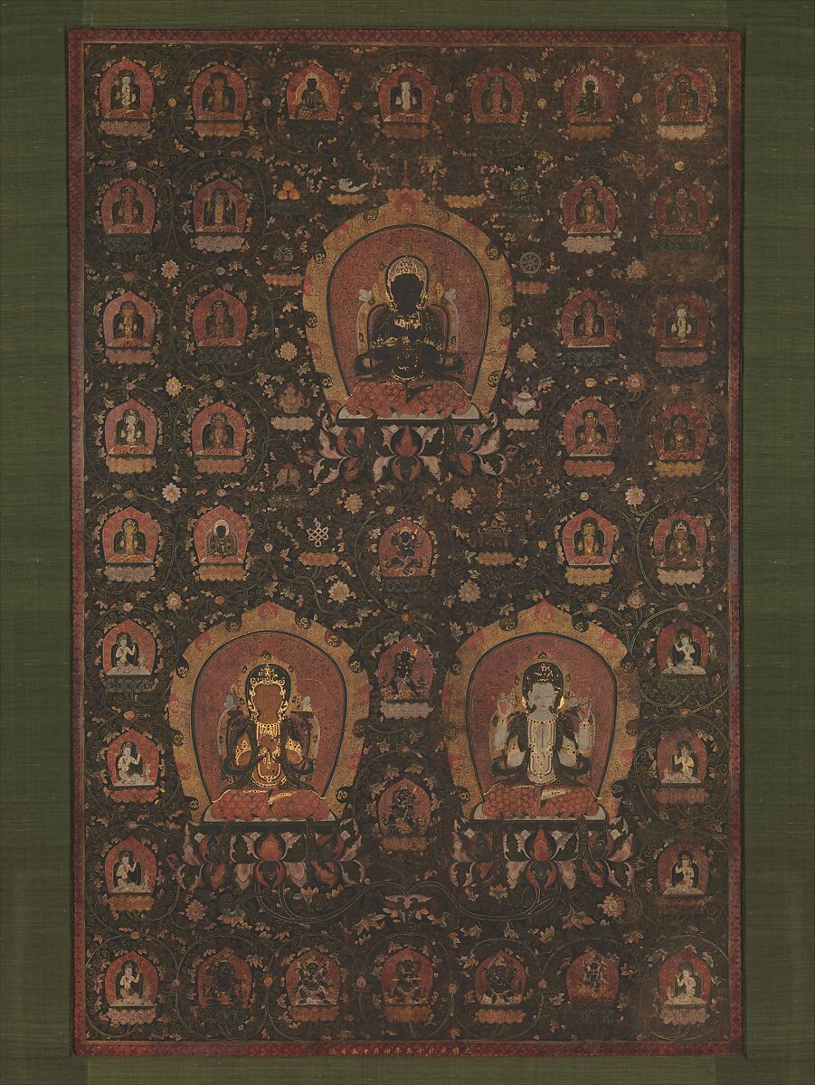 This mandala, or cosmic diagram used in meditation, is painted in rich colors on a coarse cloth ground in the Tibetan manner, but the presence of a Chinese dedication along the lower margin as well as a number of distinctive stylistic features suggest that it was the product of an atelier in China that created images based on Tibetan prototypes. Stylistically, the mandala is related to three others, dated between 1477 and 1479, which are now in the collections of the Museum of Fine Arts, Boston, and the Victoria and Albert Museum, London.