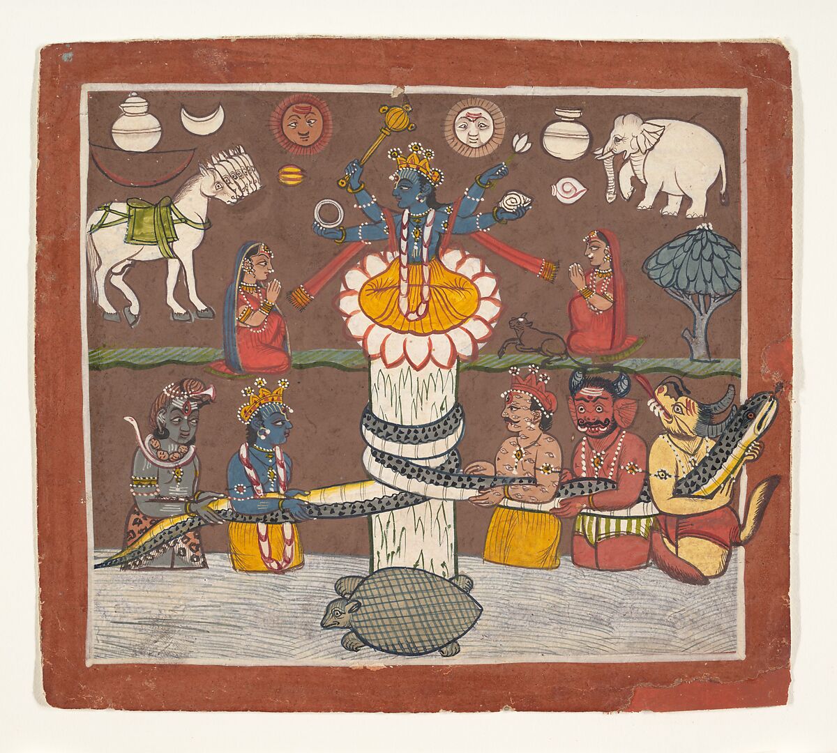 At the time of the great deluge aeons ago, many treasures— including amrita, the nectar of immortality—were lost beneath the primordial ocean. Gods and demons still jockeying for power decided to raise these powerful objects from the watery depths. They harnessed the serpent Vasuki as a rope to turn Mount Mandara and Vishnu assumed his tortoise avatar to support the giant pivot. The demons, tricked into pulling the head of the snake, were weakened by its poisonous breath. Here, many of the treasures have already been raised and are visible in the sky, while Vishnu is seen twice, below and atop the peak.