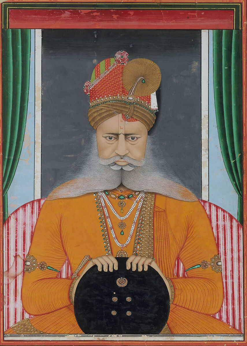 Maharaja Sardar Singh (r. 1851–72) is captured here in an extraordinary portrait whose creator was undoubtedly aware of the inroads photography was making among royal patrons. At first glance, the work seems one of almost photographic realism. However, Chotu has carefully manipulated the painting's elements to play two and three-dimensional forms against one another, achieving a slightly surreal effect that is heightened by the composition's commanding symmetry, even down to the cleft beard and the bosses on the shield. The regularity is offset by the asymmetry of the pleated shawl and garment and by the fantastical turban, which is like some postmodern assemblage crowning the brooding visage.