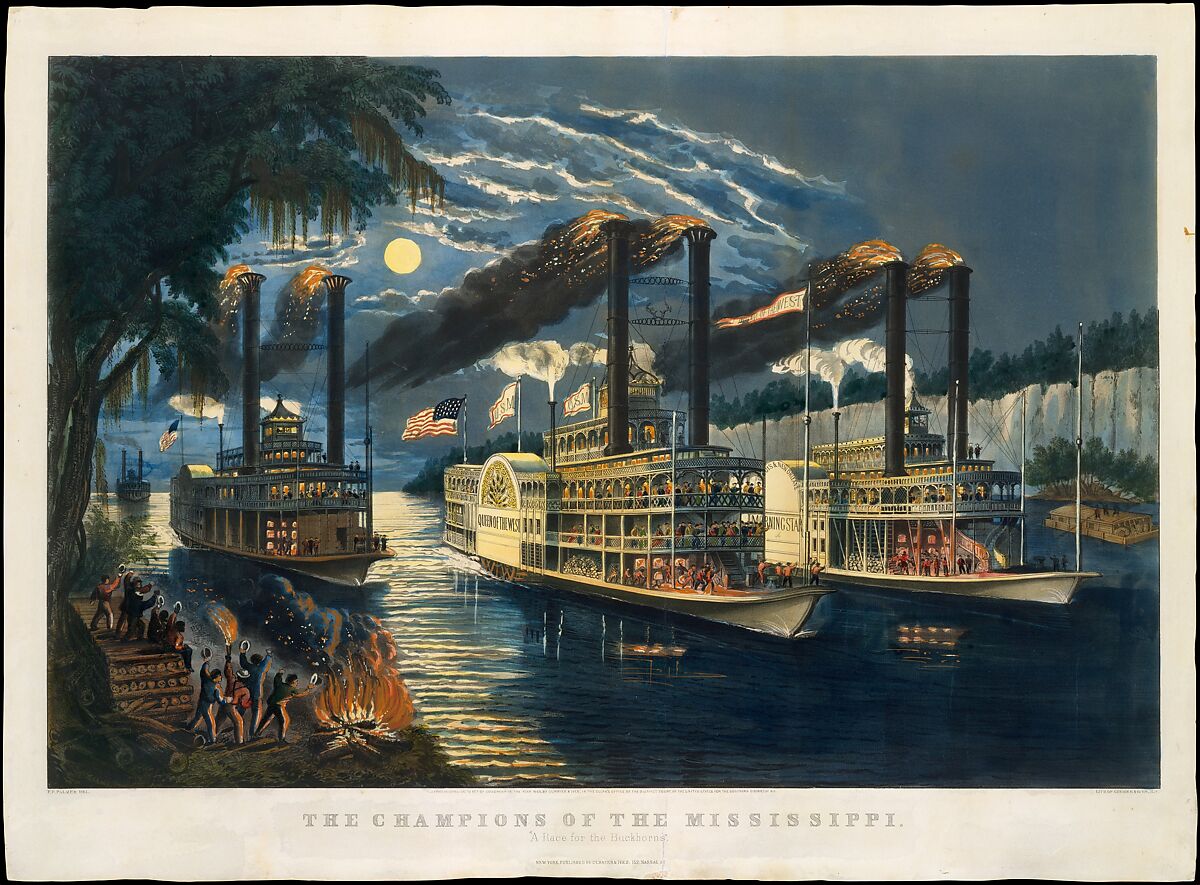 The Mississippi River, one of the world's great rivers, intrigued Americans. Steamboats provided important and practical large-scale transport of passengers and goods both up and down this mighty river; such riverboats were able to navigate the shallow waters, as well as upriver against strong currents. Currier & Ives issued more than thirty prints of activity on the river, with steamboat races ranking among the most popular images. In this print's dramatically moonlit Mississippi River scene, four steamboats, with flames and smoke trailing from their smokestacks, travel under full power. At the right of the image, the "Queen of the West" and "Morningstar" lead the race, while two steamboats sail behind. On the shore at the left, there is a bonfire and a small crowd of men cheering and waving to the boat passengers. The print's title identifies this race as one "for the buckhorns;" the victorious boat would be entitled to mount and carry the prize (a stag's antlers) between her stacks for a year.