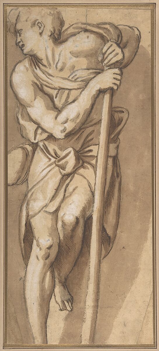 This imposing figure study of a man of Michelangelesque anatomy, partly standing and leaning on a long staff, is carefully rendered in a highly pictorial technique of brown washes and white gouache, over a preliminary underdrawing in black chalk; some areas in the wash shading are enhanced selectively with pen-and-ink hatching. The thick, dark contours done with the brush, as well as the marked tonal contrasts, remind one of 16th century chiaroscuro woodcut techniques.