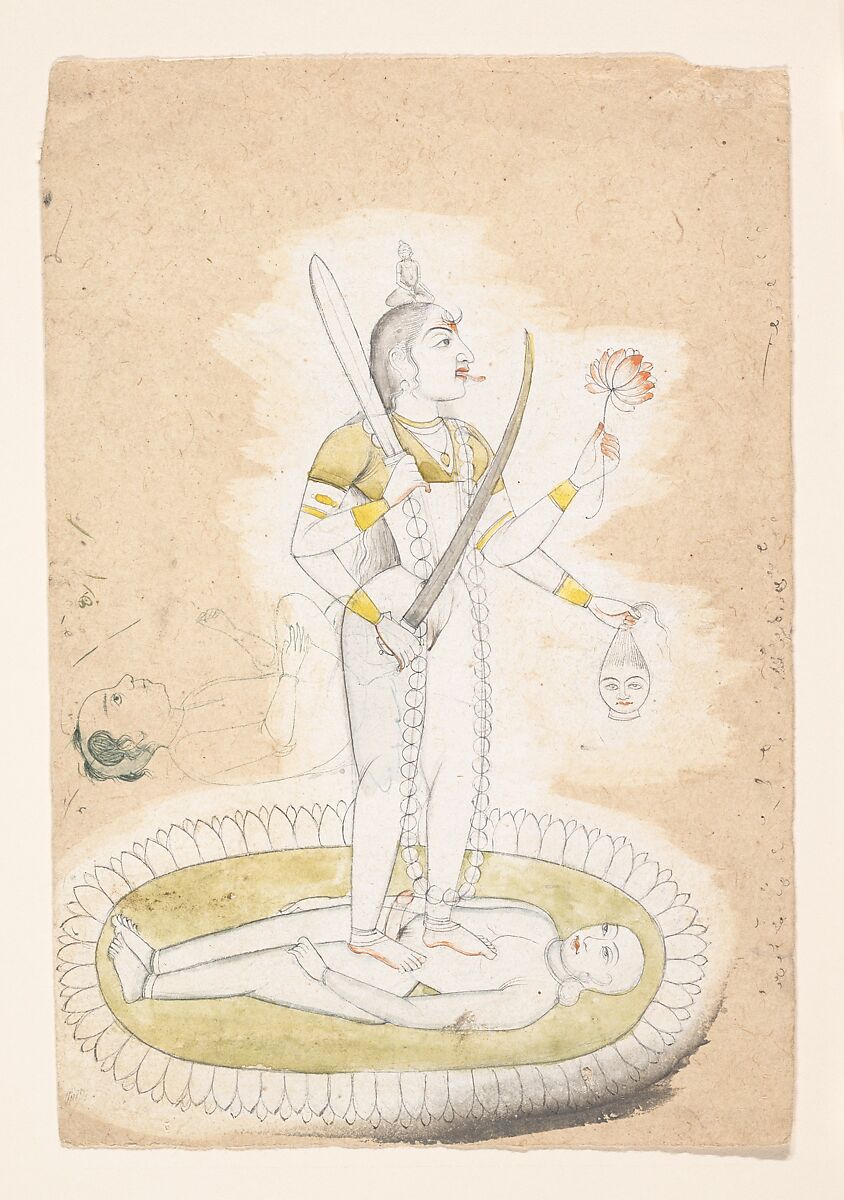 This finely rendered drawing sheet has two discreet images, oriented in different directions. The ensemble with Kali seems to have predominated, not only in size but also through the use of color. White has been used to strengthen the image, and most of the ink lines that comprise the image are superimposed over it. It has also been used—for example, in the hair of the goddess and her sword—to make corrections. Color was added as well, moving the drawing further toward a finished work instead of a mere sketch.