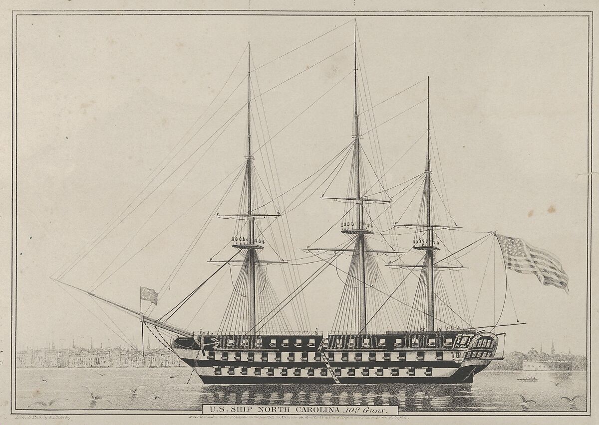 Proof. A marine print. A three-masted ship faces left with an American flag flying off the stern. The New York City skyline is visible behind the ship; Castle Garden at right. Unlike many Currier prints, this lithograph has not been hand-colored.