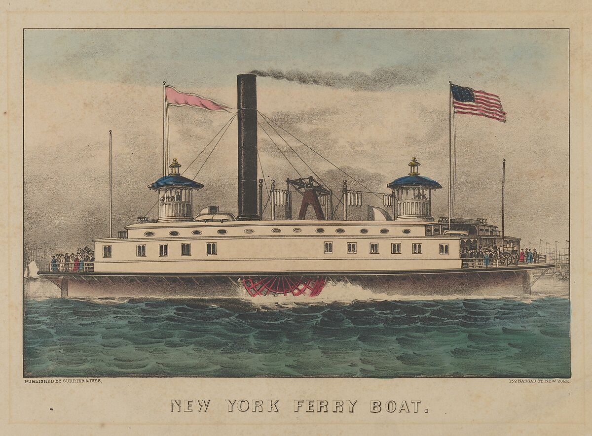 In this marine view, a ferryboat moves left, smoke billows from its central stack, and two large American flags stream backwards, with passengers seen on the decks. Densely packed masts of moored ships in the right background indicate a site near the piers and docks that line Manhattan's southern tip.