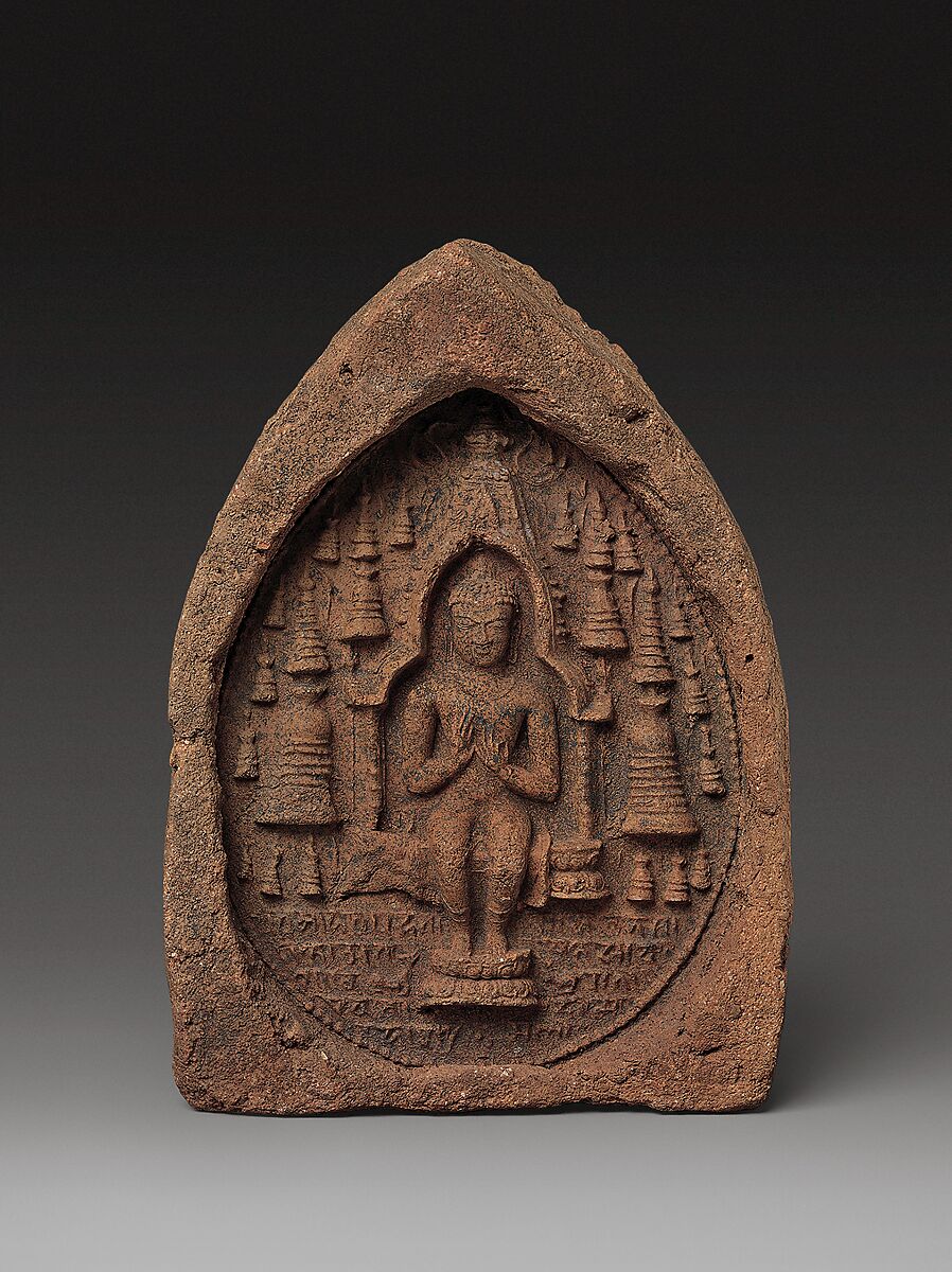 Such plaques were made of clay from sacred pilgrimage sites and hence had intrinsic power as relics for pilgrims. The Buddha sits in a temple like the one at Bodhgaya, where he reached enlightenment; surrounding him is a forest of stupas and below is the same ye dharma verse found on the Buddha from Nalanda outlining the path to enlightenment, or Buddhist dharma.