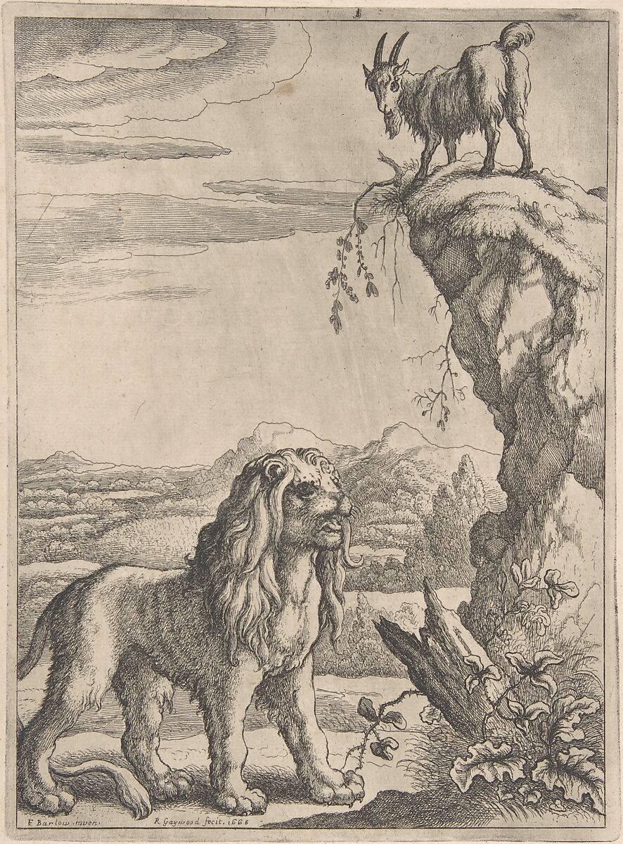Gaywood based his etching on a drawing by Francis Barlow (see 54.645.1), England's first native book illustrator remembered for his accomplished depictions of animals and birds. Many of the latter illustrated fables, and this example comes from a group published by John Ogilby. The fable tells how a humble goat wisely chose to remain safely on a hill, resisting the enticements of a kingly lion who secretly wishes to eat him. The print was published at the end of a tumultuous decade that saw the dissolution of Oliver Cromwell's Protectorate, restoration of Charles II to the throne, succession of his brother James II and, finally, the latter's ouster by the Dutch-born William III and his wife Mary II. The moral of the fable asserts that it is: "Better be Captain in the smallest Fort, Than be commanded in a Princes Court."