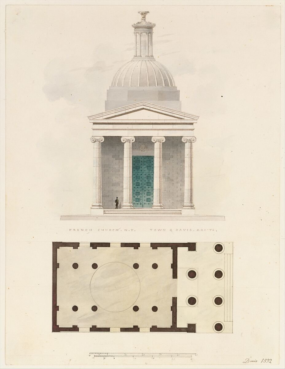 This drawing shows the frontal elevation and floorplan of the Church of the French Protestants. The classical shape of the portico in this design may have been inspired by William and Henry William Inwood's Saint Pancras New Church, London (1819–22). The interior was based on Christopher Wren's Church of Saint Stephen's Walbrook, London (1672–79). The dome was destroyed by fire in 1839, and the entire building was demolished in 1864.