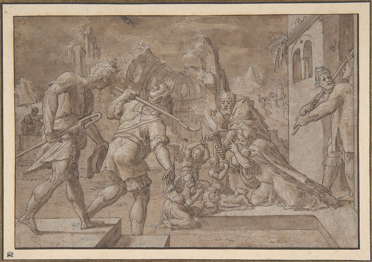 - Medium: Pen and brown ink, brown wash, and white gouache on off-white paper prepared with light brown wash; framing line in pen and brown ink