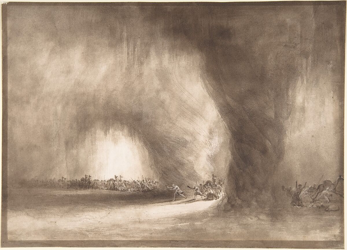 West settled in Bristol in the 1820s and was quickly recognized as a leader by local artists. This work belongs to a group of monochrome drawings he made while associated with the Bristol Sketching Society before 1840. Members met at one another's houses, and a contemporary recorded West as having made "sketches at the drawing parties which delight all who see them . . . chiefly Eastern scenes . . . illuminated by . . . all kinds of natural and preternatural light." Here, he laid in the primary elements using brown wash, then turned to pen and ink for details, and scratched into the pigment to create highlights. Two swirling pillars of cloud recall the Old Testament subject of the Israelites crossing the Sinai desert, but close inspection indicates that West likely intended to represent an oriental camel train threatened by huge dust devils.