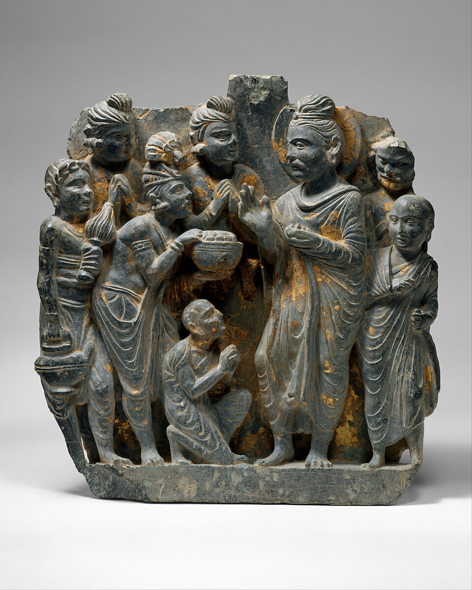 The identification of the subject of this relief as the Gift of Anathapindada is by no means certain. The presence at the far left of the figure holding a waterpot suggests that a gift is about to be made, as a donor traditionally poured water over the hands of a recipient to seal a gift. However, determining the overall meaning depends on identification of the objects in the bowl being proffered to the Buddha. Sudatta, called Anathapindada (the Incomparable Almsgiver), was the richest merchant of the town of Sravasti (in Kosala). He met the Buddha at Rajagriha and proposed to donate money in order to buy land for a monastery in Sravasti. The amount of the payment exacted from Anathapindada was calculated by covering the grounds of the park to be purchased with gold coins. The identification of the objects in the bowl as coins is speculative, and the precise scene in the life of the Buddha that is represented is therefore unclear.