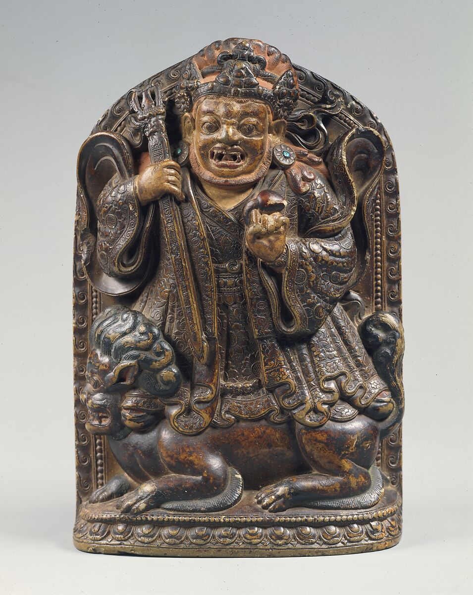 Dharmapalas, defenders of the dharma, the Buddha’s teachings, represent a category of wrathful guardians essential to the Tibetan system of Buddhism. They are understood to be enlightened beings. This fearsome protector stands astride an equally expressive lion, warding off spiritual dangers.