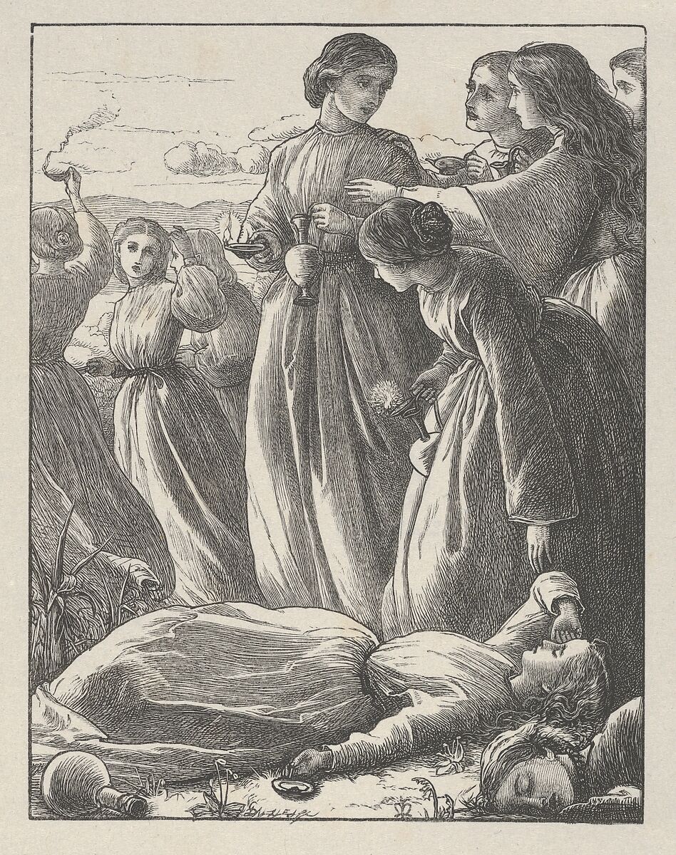 The Parable of the Ten (or Wise and Foolish Virgins) appears in Matthew 25: 1-13 and inspired Millais to make two designs. In this first image he contrasts two groups of girls. The wise ones have remained awake and kept their lamps ready so that when a wedding feast is suddently announced, they are prepared for a nighttime journey. Their foolish companions have, however, fallen asleep and let their lamps burn out which means they will miss the celebration. Pre-Raphaelite ideals shaped the combination of detailed naturalism and down-to-earth imagery to produce a work distinctly different than most religious art of the period.