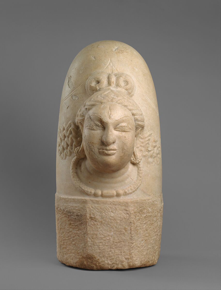 The linga, the aniconic pillar symbol emblematic of the Hindu god Shiva, symbolizes his essential generative powers. Here, the form is phallic, addorsed with Shiva’s face in a style reflecting iconographic innovations of the region as well as inherited design conventions from fifth-and sixth-century Gupta north India. The Shahi kingdom flourished in eastern Afghanistan only from the seventh to the ninth century, yet it produced a highly distinctive corpus of Hindu religious imagery. Typically sculpted in white marble, these works reflect links east, most notably to Kashmir for Shaiva imagery, and west, as seen in the flying locks of hair inspired by Sasanian royal imagery.
