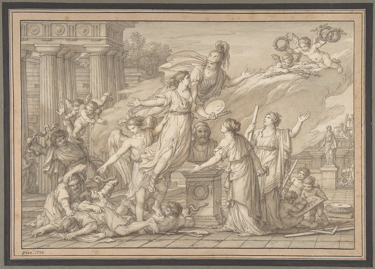 In 1789, he was named to the post of director of the Académie Royale, the powerful arts organization under the Bourbon monarchy. Following the Revolution, the institution was dissolved in 1793. In 1796, at age eighty, Vien was made a member of the paintings division of the newly formed Institut de France. In this highly finished drawing made the same year, allegorical figures representing the arts are grouped around a bust of Homer and guided by the example of the antique.